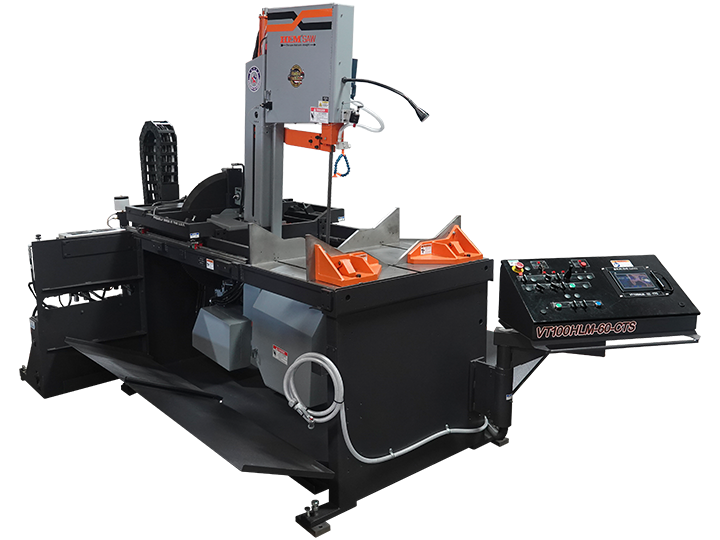 The V/VT100 Saw Series includes a number of choices covering a range of needs. From semi-automatic operated models to fully automatic, programmable PLC-driven touch screen controls this saw series covers many bases. Models feature capacity of 18”w x 20-3/4” h and include both air-operated and hydraulic operating systems. The bar-feed on automatic model advances material up to 48” per index with multiple indexes possible. Programmable for both miter angles and lengths, the control on the automatic control permits job retention and assembling multiple jobs into programs for automated production of sub-assembly part “kits”.